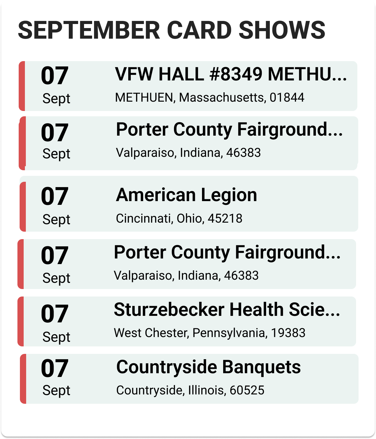 Details: Local Massachusetts card show hosted at VFW Hall.Card Show – Porter County Fairgrounds Expo East
