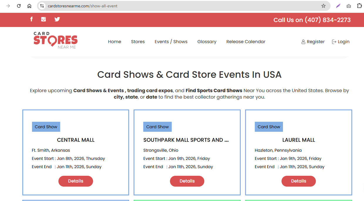 If you are searching for card shows near me, CardStoresNearMe.com makes it easy to find upcoming trading card shows in your area. Whether you collect sports cards, Pokémon, Yu-Gi-Oh, Magic: The Gathering, or other collectibles, our event calendar helps collectors, vendors, and show organizers connect in one place.