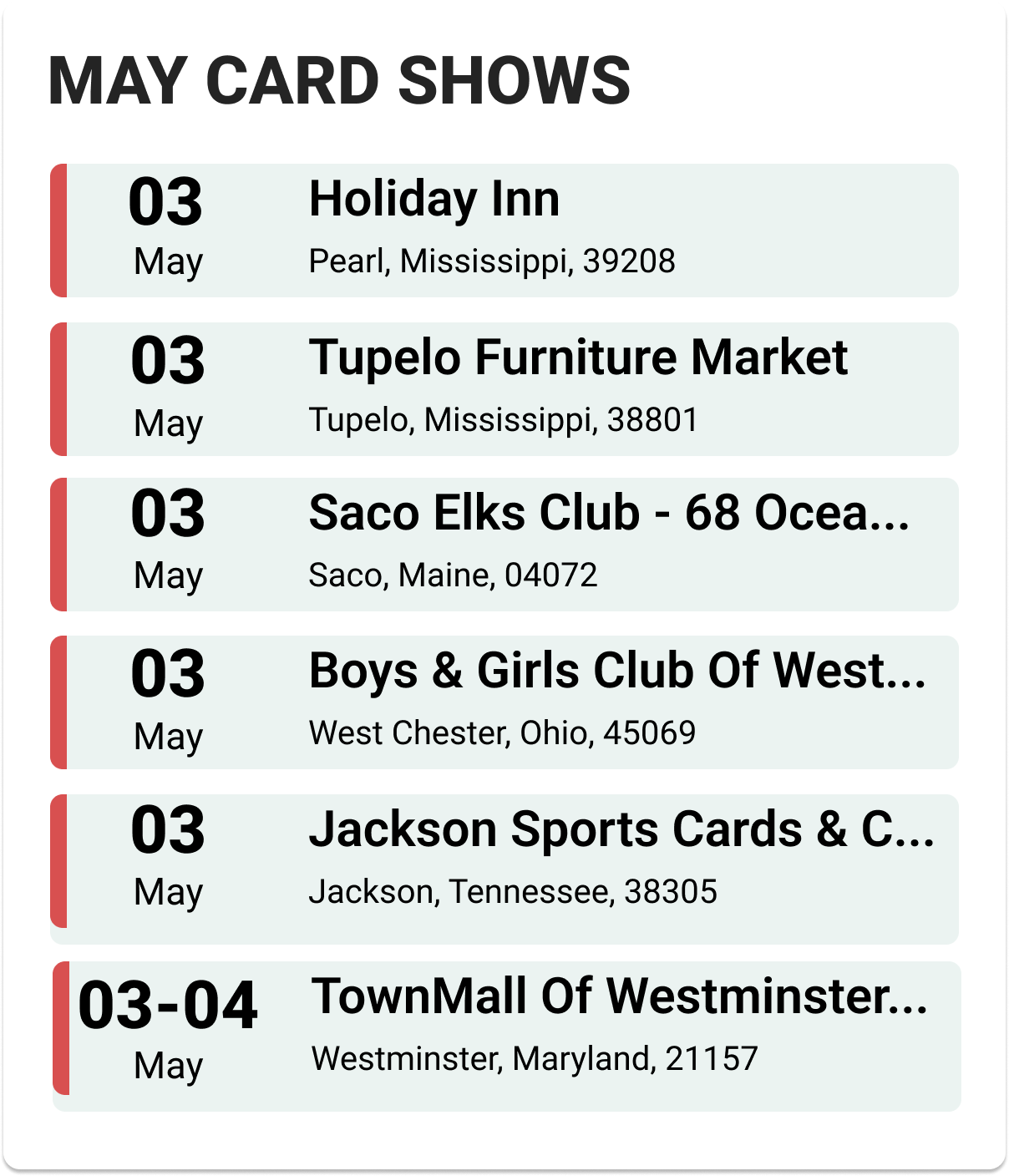 Details: A lively show featuring a wide variety of sports cards and collectibles in Tupelo.
