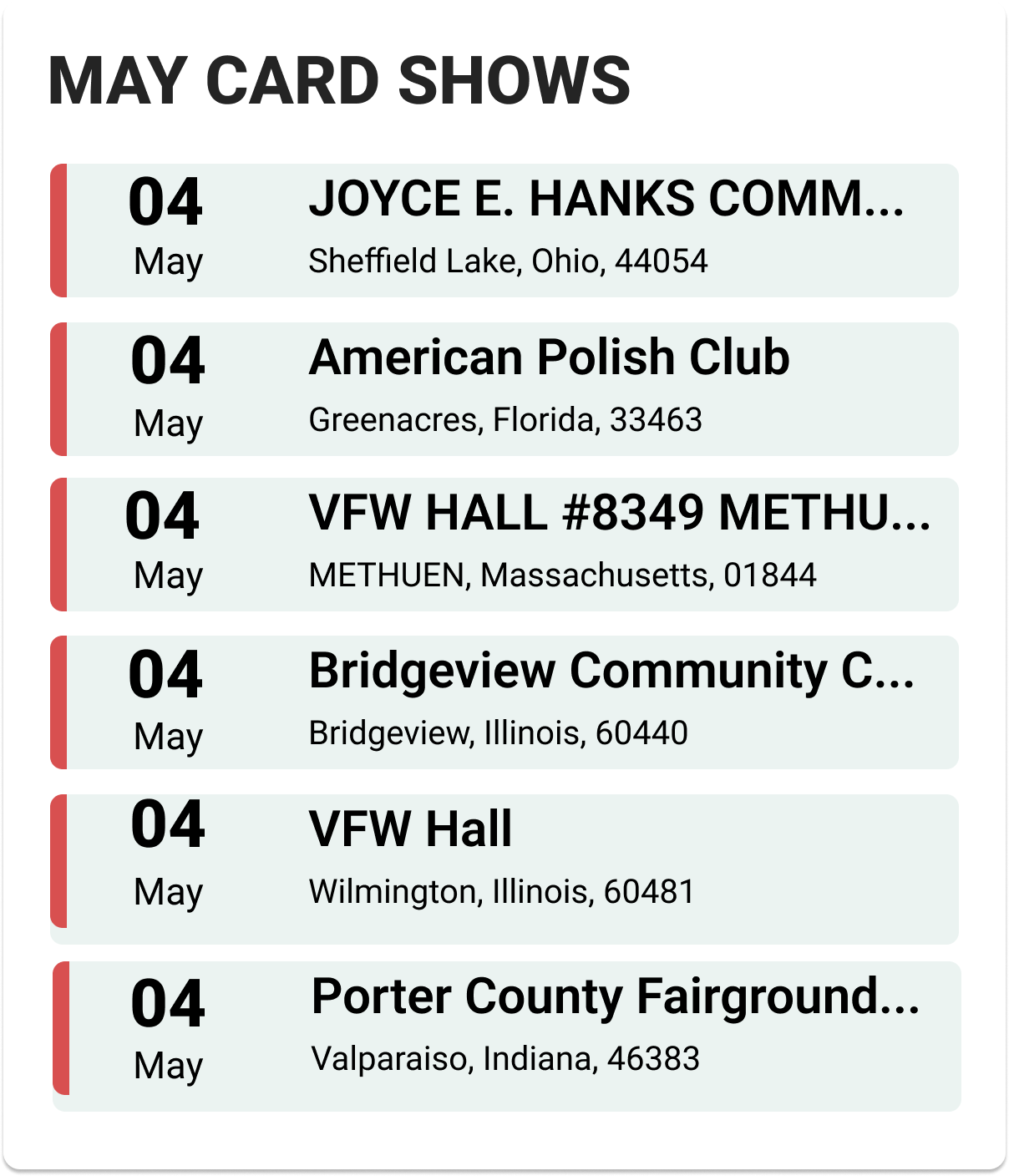 Details: Hosted at the American Legion, this show provides a relaxed setting for sports card enthusiasts.