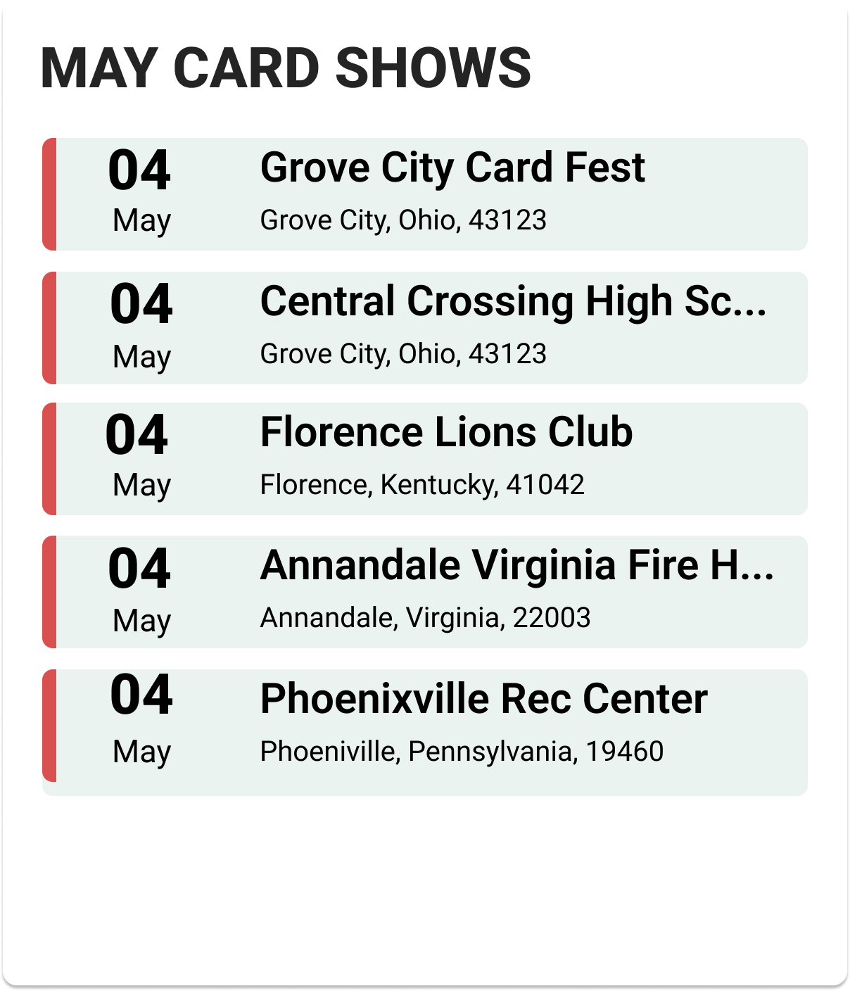 Details: A community-centered card show at the Phoenixville Rec Center for Pennsylvania enthusiasts.
