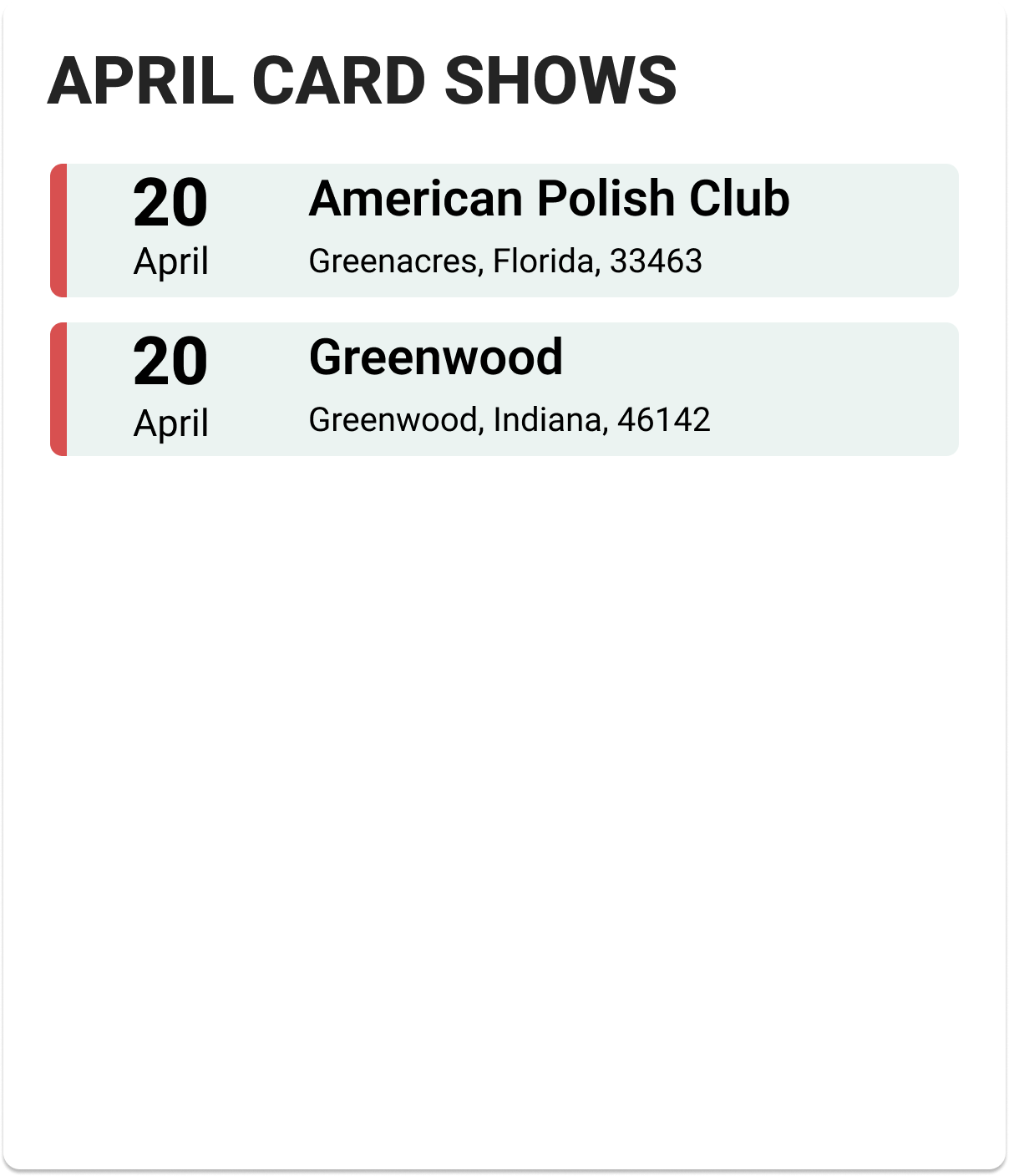 • Details: Local trading card show hosted at the American Polish Club, featuring sports and non-sports collectibles.